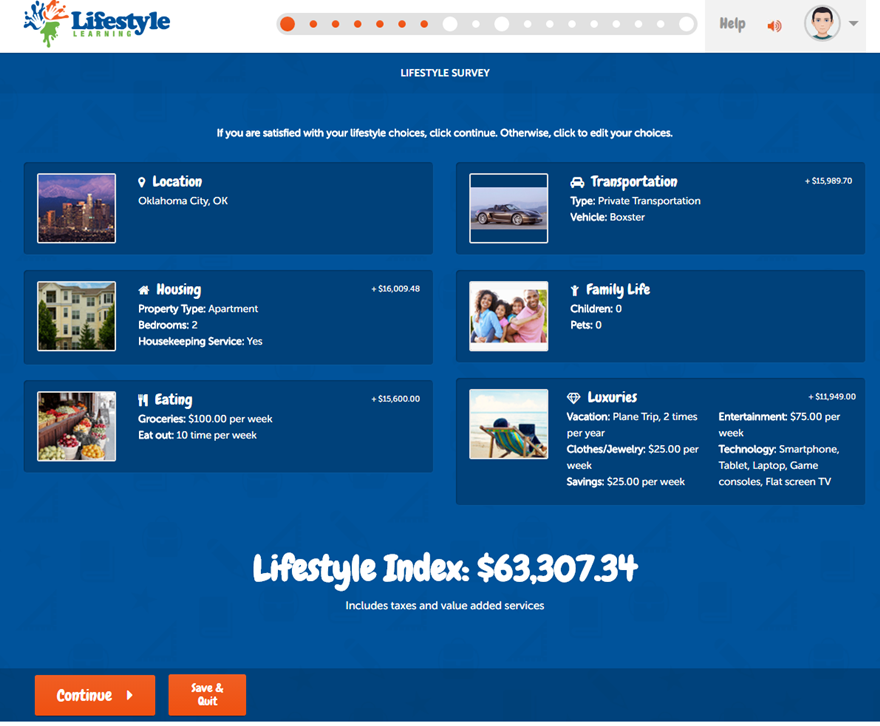 Displays a breakdown of each survey tab and final Lifestyle Index. Clicking on any image or tab label will allow you to go back and change your choices. |