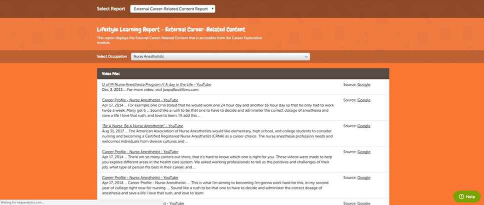 This report displays the External Career-Related Content that is accessible from the Career Exploration module. |