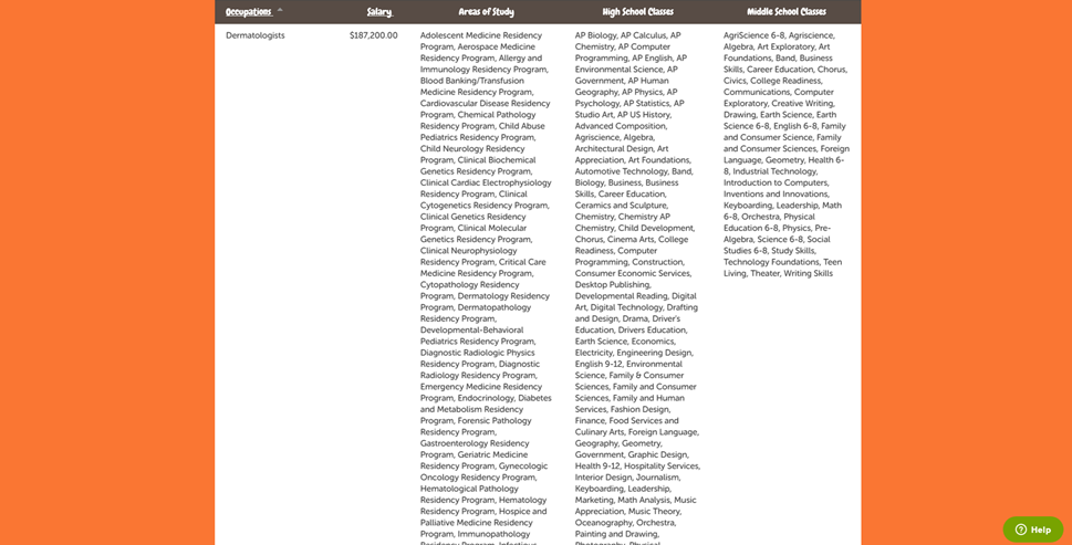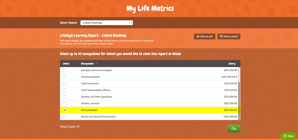 This report displays the middle school/high school classes, post-secondary areas of study and occupations that link to the generated Lifestyle Index. |