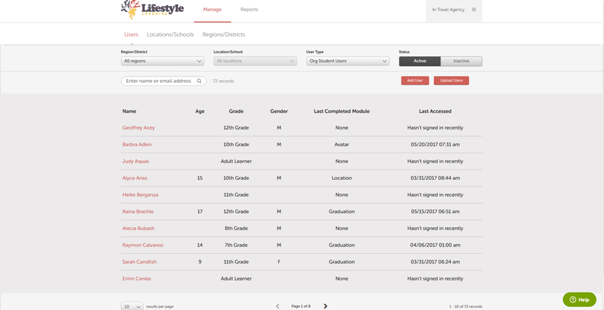 Displays all Users connected to the organization. Displays columns for name, age, grade, gender, last completed module and last accessed. |