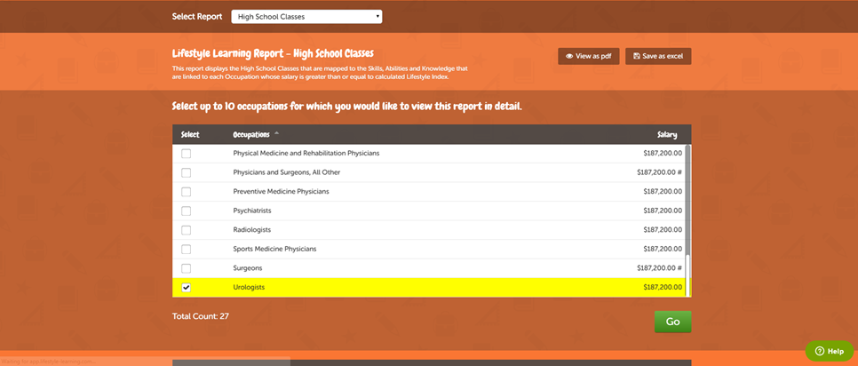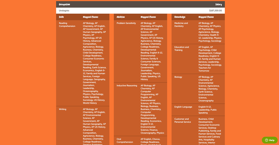 This report displays the Middle School Classes that are mapped to the Skills, Abilities and Knowledge that are linked to each Occupation whose salary is greater than or equal to calculated Lifestyle Index. |